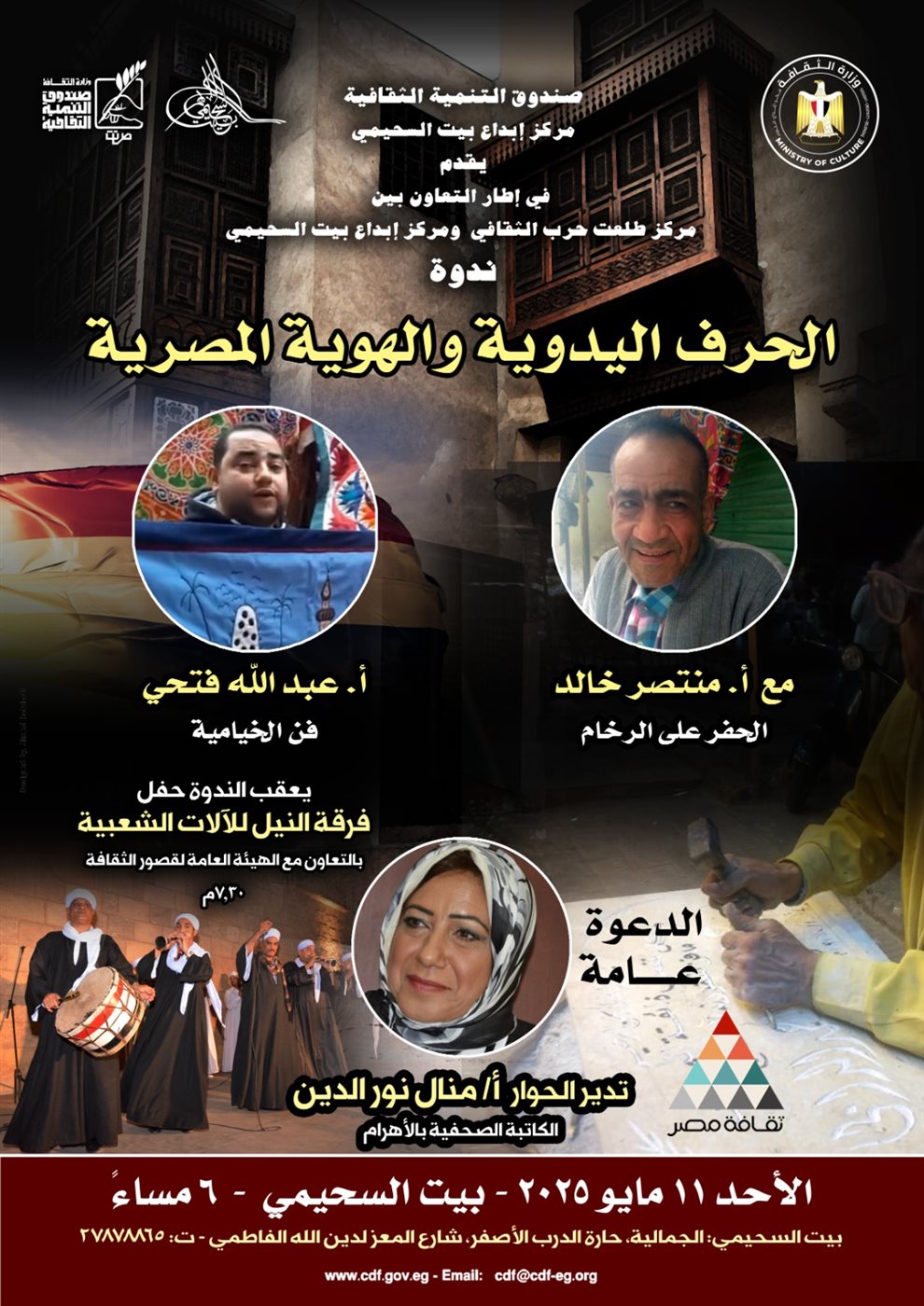 يتحدث في الندوة منتصر خالد، أحد المهتمين والفاعلين في مجال توثيق وصون الحرف التقليدية، مستعرضًا تجاربه وخبراته في العمل الميداني، وأوجه الترابط بين الحرفة اليدوية والانتماء الوطني والهوية المصرية، إلى جانب الأستاذ عبد الله فتحي، المتخصص في فن الخيامية، والذي يتناول دور هذه الحرفة التراثية في التعبير عن ملامح الهوية الثقافية المصرية.