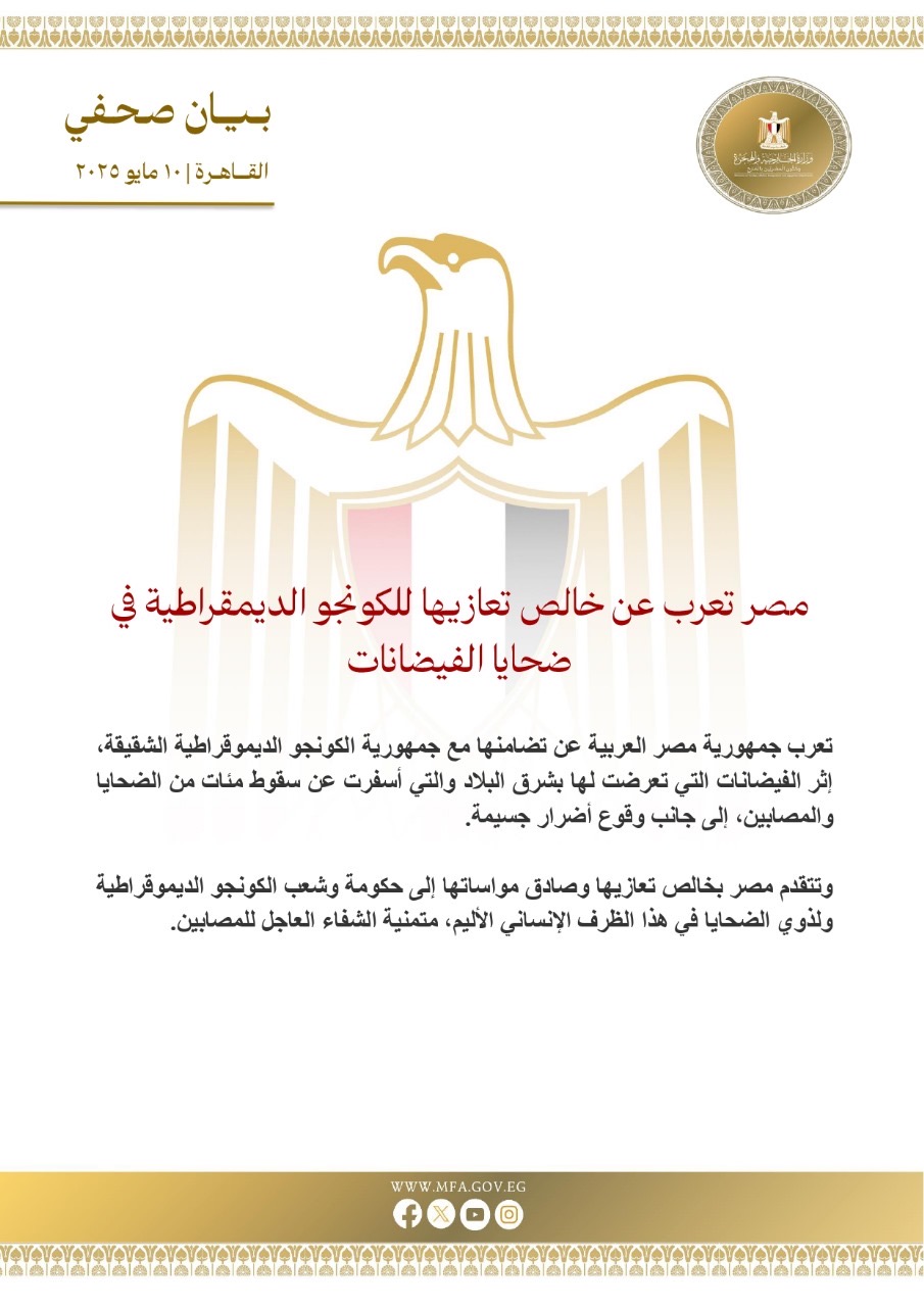 وتتقدم مصر بخالص تعازيها وصادق مواساتها إلى حكومة وشعب الكونغو الديموقراطية ولذوي الضحايا في هذا الظرف الإنساني الأليم، متمنية الشفاء العاجل للمصابين.