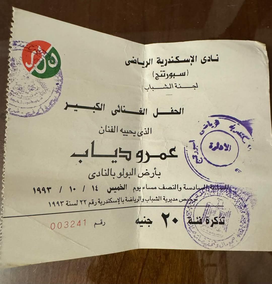 في صيف عام 1993، كان نادي الإسكندرية الرياضي (سبورتنج) وجهة لعشاق الفن والموسيقى، حيث أقيمت حفلات لكبار النجوم، وفي واحدة من أبرز الليالي، أحيا عمرو دياب حفلًا على أرض البولو بالنادي، واستمرت فقرته الغنائية لمدة ساعتين، وكانت تذكرة الدخول بسعر 20 جنيهًا، وهو ما اعتُبر حينها السعر الأعلى مقارنة ببقية الفنانين، ما يعكس شعبيته المتنامية وقيمته الفنية منذ بداياته.