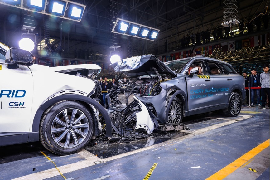 وتضمن الاختبار الأول محاكاة تصادم أمامي كامل بنسبة 100% بين سيارتين، في حين اختبر التحدي الثاني قدرة سيارة TIGGO9 CSH، على تحمل انقلاب عالي السرعة.