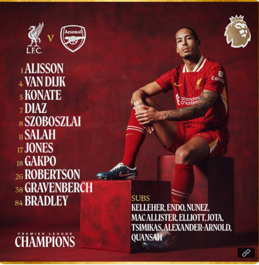 ويحتل ليفربول صدارة الدوري الإنجليزي برصيد 82 نقطة، حيث حسم لقب الدوري الإنجليزي خلال الجولة قبل الماضية، في حين أن آرسنال لديه 67 نقطة، حيث يحتل حاليًا المركز الثاني في جدول البطولة.