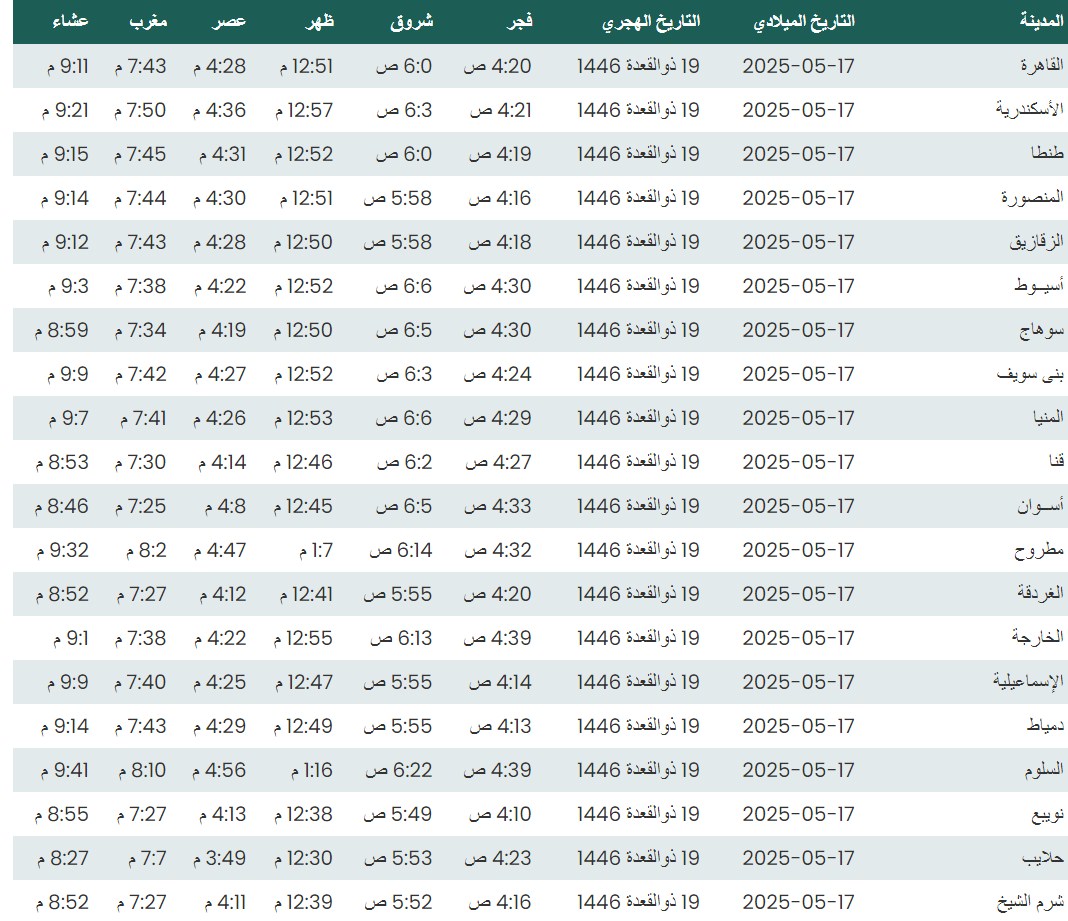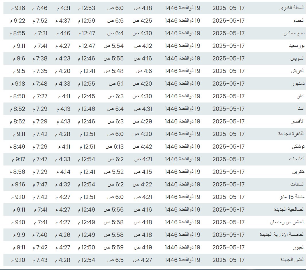 وفيما يلي مواقيت الصلاة، لعدد من مدن ومحافظات الجمهورية من واقع بيانات الهيئة العامة للمساحة