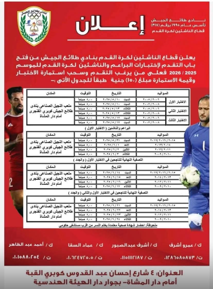 موعد اختبارات الناشئين بنادي طلائع الجيش 2025