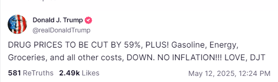 وقال الرئيس الأمريكي دونالد ترامب بشأن القرارات الجديدة التي سيتخذها: "ستُخفض أسعار الأدوية بنسبة 59%، بالإضافة إلى ذلك! ستنخفض أسعار البنزين والطاقة والبقالة وجميع التكاليف الأخرى. لا تضخم!!! مع حبي، دي جي تي"