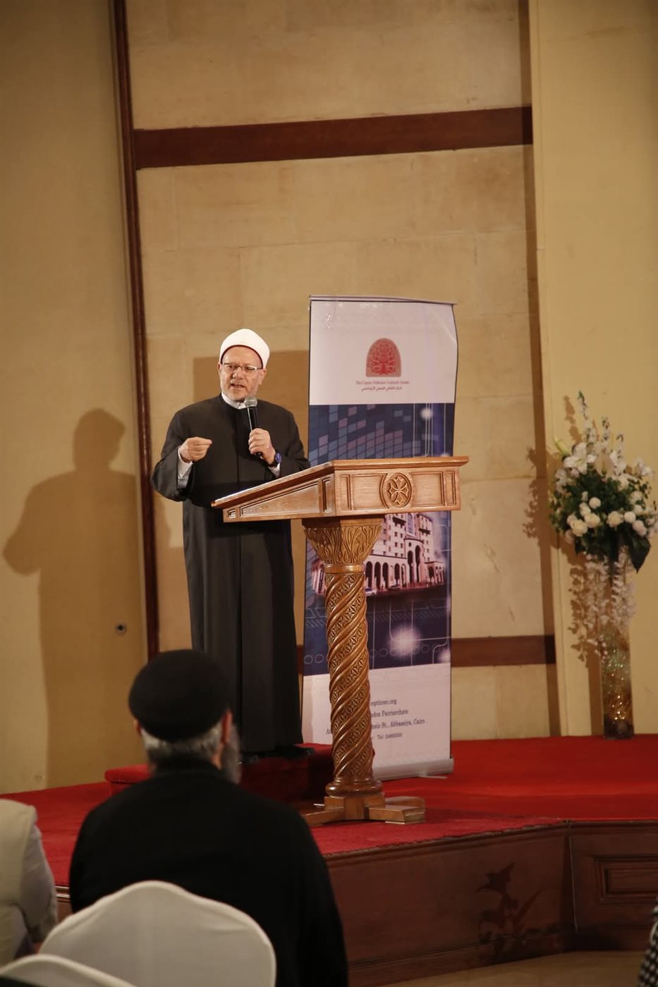 وأهدي الأنبا إرميا الأسقف العام رئيس المركز الثقافي القبطي الأرثوذكسي،درع المركز للدكتور شوقي علام، موجهًا له الشكر على ما قدمه خلال السنوات الماضية، مؤكدًا أنه رسخ خلال مسيرته صورة المفتي كعالم مجدد وقائد واعٍ بالتحديات العالمية والدولية، وتميز بعقلية مؤسسية ورؤية تجديدية جمعت بين عمق التكوين الأزهري والانفتاح على أدوار هذا العصر، فوضع دار الإفتاء في صدارة المؤسسات الدينية عالميًا.