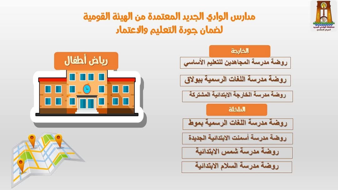 وأوضح أن قرار الهيئة تضمن 24 مدرسة بإدارات الخارجة والداخلة وبلاط وباريس التعليمية، منها (7) بمرحلة رياض الأطفال و(12) مدرسة بالمرحلة الابتدائية و(5) مدارس بالمرحلة الإعدادية.