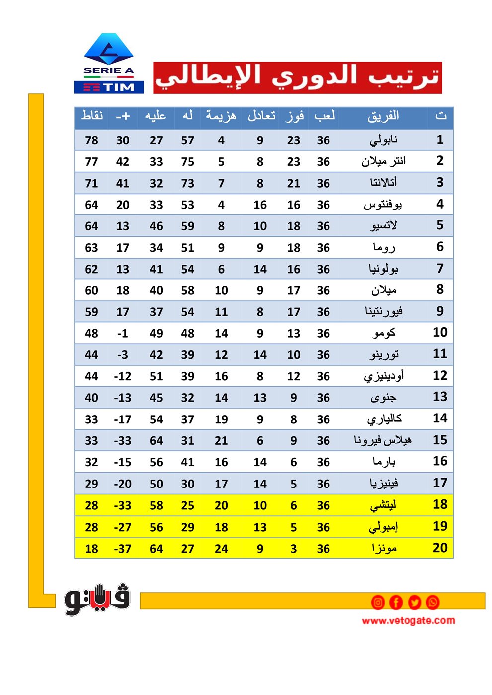 ترتيب الدوري الإيطالي بعد الجولة الـ 36