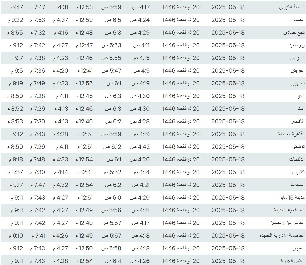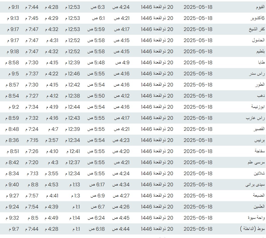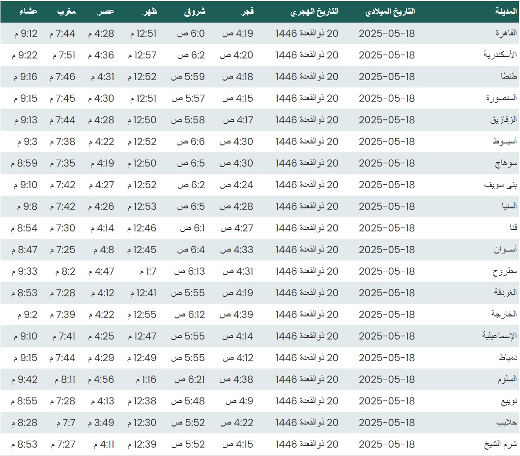 وفيما يلي مواقيت الصلاة، لعدد من مدن ومحافظات الجمهورية من واقع بيانات الهيئة العامة للمساحة