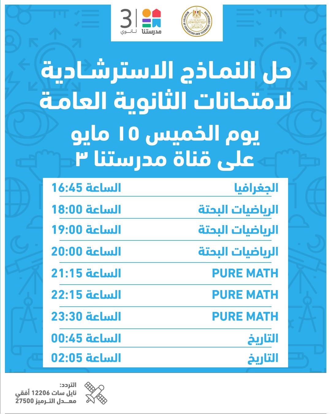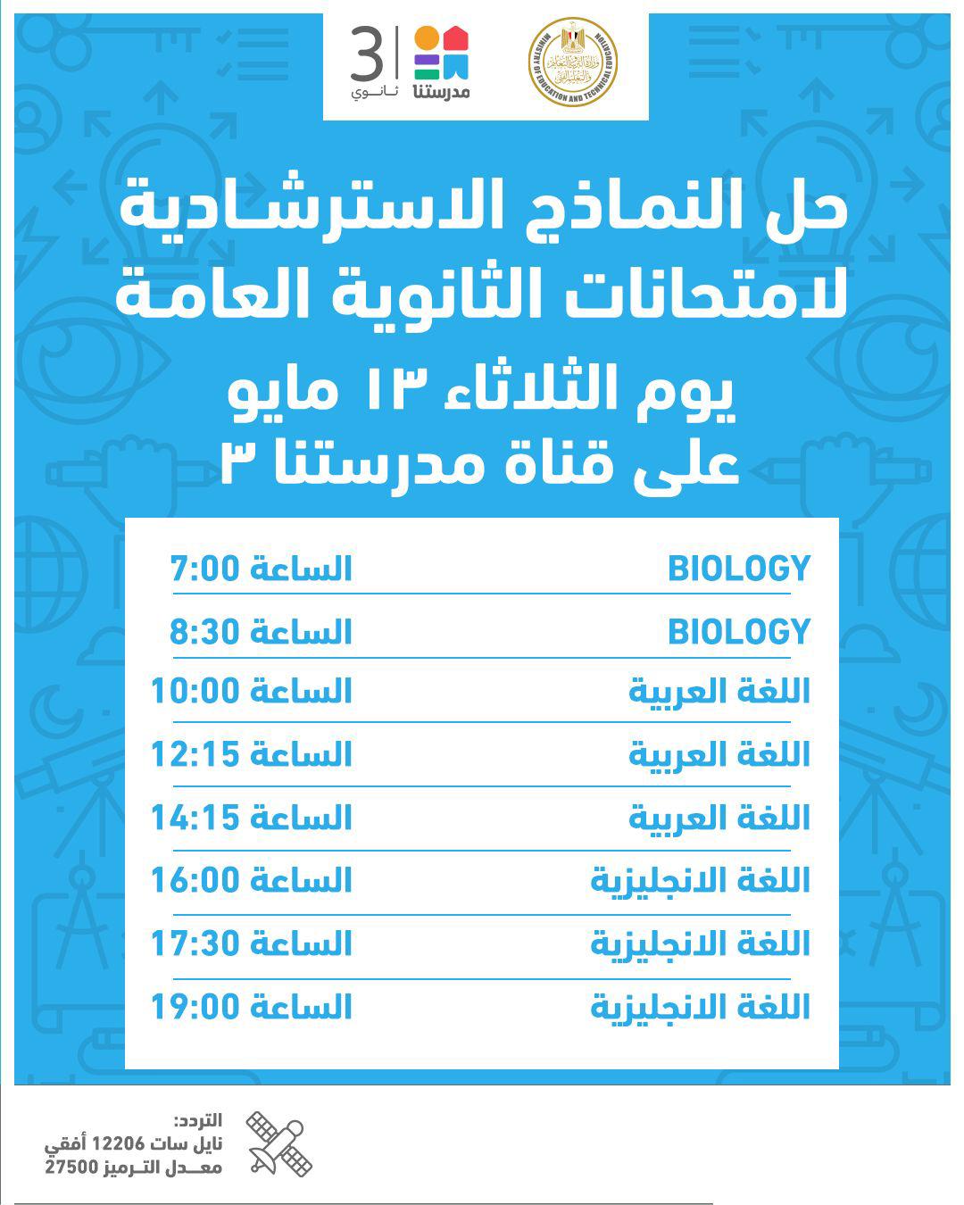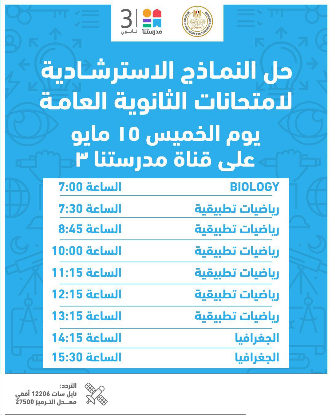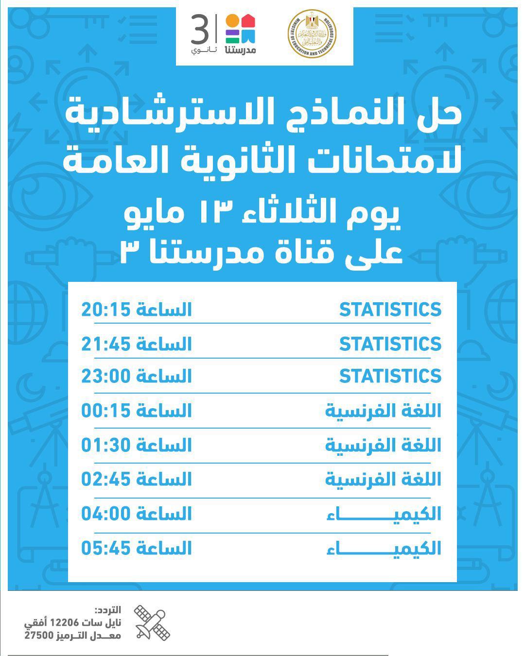 كما توفر الوزارة إتاحة حلول النماذج الاسترشادية عبر قناة "مدرستنا ٣" على مدار الساعة، وذلك عبر تردد القناة على النايل سات 12206 أُفقي معدل ترميز 27500.