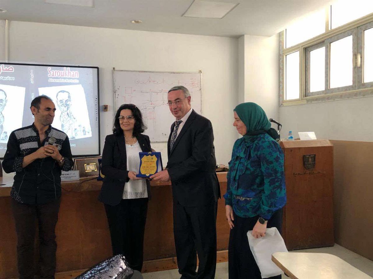 وأوضحت أن متحف الكلية يعتبر واحدًا من أهم المتاحف الفنية الملحقة بالكليات الفنية في مصر، حيث يذخر بالعديد من الأعمال الفنية لجيل الرواد الأجانب الذين تتلمذ على أيديهم الرعيل الأول من الفنانين المصريين. وفي ختام كلمتها قامت الدكتورة: نيفين غريب والدكتورة: أماني رضا بتقديم درع الكلية وشهادات تقدير للأستاذ الدكتور: جورج نوبار، والباحث والكاتب: عبدالله الصاوي، والسيدة: سيلفا نارديان حفيدة الفنان الراحل: صاروخان، والدكتور: محمد عبد السلام، على ما بذله من مجهودات في التنسيق للاحتفالية، ودعت ضيوف الاحتفالية لزيارة المتحف لمشاهدة مجموعة نادرة من البورتريهات الكاريكاتورية الأصلية لرسام الكاريكاتير ذو الأصول الإسبانية: خوان سِنتيس.