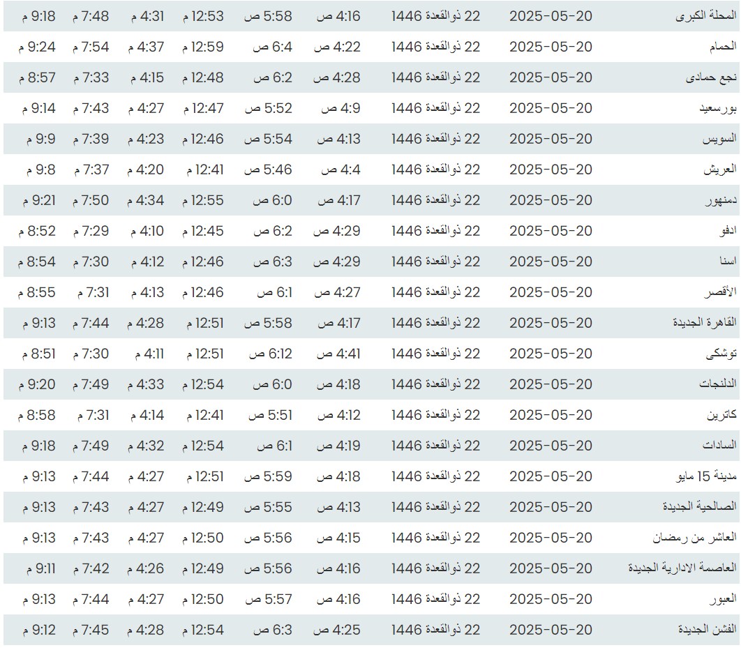 وفيما يلي مواقيت الصلاة، لعدد من مدن ومحافظات الجمهورية من واقع بيانات الهيئة العامة للمساحة