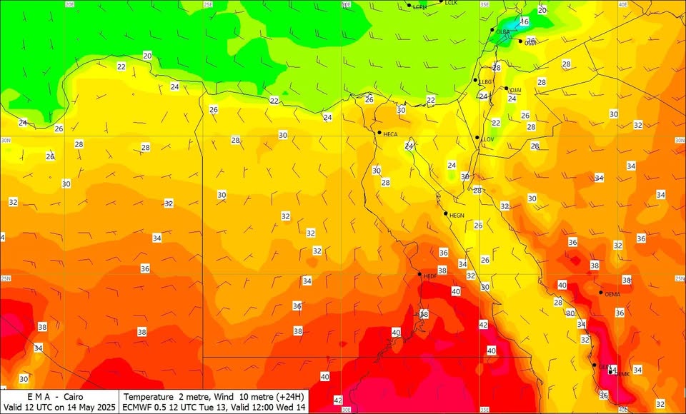 وقالت هيئة الأرصاد الجوية في منشور لها عبر صفحتها الرسمية على موقع التواصل الاجتماعي فيس بوك: أجواء حارة اليوم على شمال البلاد شديدة الحرارة جنوبا، ودرجة الحرارة العظمى المتوقعة اليوم فى القاهرة الكبرى 31 درجة، كما تنشط الرياح على السواحل الشمالية الشرقية والوجه البحرى قد تكون مثيرة للرمال والأتربة على مناطق من جنوب سيناء وشمال محافظة البحر الأحمر على فترات متقطعة، مع فرص لسقوط أمطار خفيفة على مناطق من السواحل الشمالية الشرقية على فترات متقطعة.