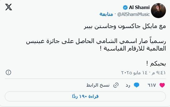 وعبر الشامي عن فرحته بهذا الإنجاز عبر صفحته على منصة "إكس" وقال: مع مايكل جاكسون وجاستن بيبر رسميًّا صار اسمي الشامي الحاصل على جائزة جينيس العالمية للارقام القياسية.. بحبكم.