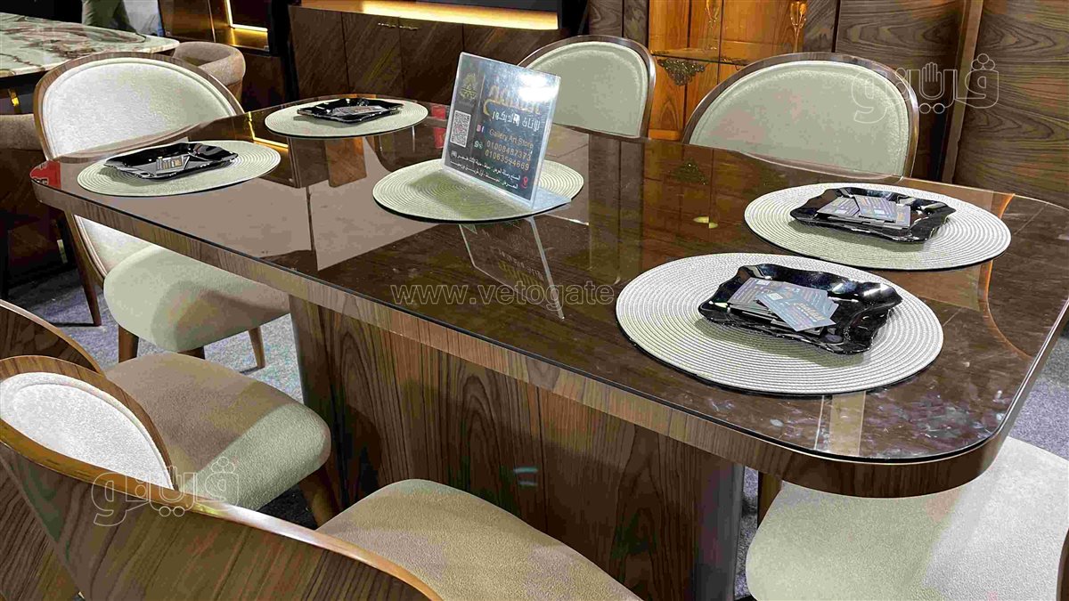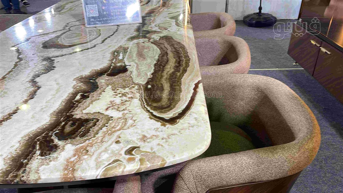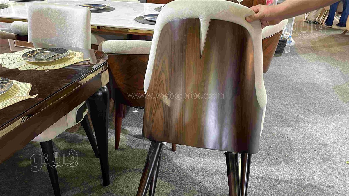 كما عرض نموذجًا لطاولة سفرة رخام إيطالي فاخرة، مشيرًا إلى إمكانية التعديل في الخامات والتصميمات، مع ضمان على جميع المنتجات الخشبية الطبيعية، مع توفر خيارات متنوعة لعدد الكراسي.