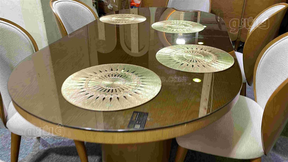 عرض الشامخ نموذجًا آخر لسفرة مصنوعة من "خشب زان" مع "قشرة أرو طبيعي"، مؤكدًا على جودة الخامات والتشطيبات المتاحة بألوان متنوعة.