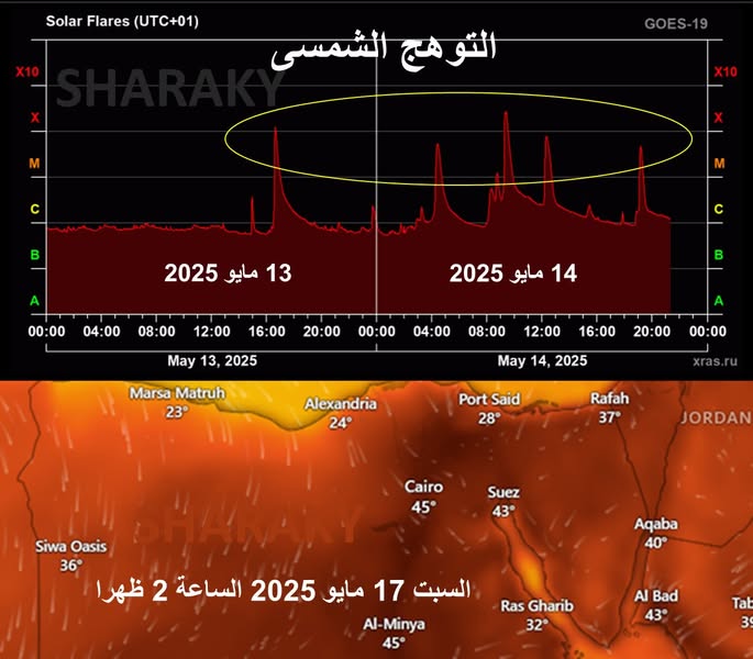 وأضاف: " الثلاثاء 13 مايو 2025 الساعة 8 م بتوقيت القاهرة، رصد انفجار شمسى بقوة "X"على سطح الشمس، واليوم 4 انفجارات أخرى منها أشد انفجار هذا العام "X2.7" وثلاثة "M"، تتسبب الانفجارات في انبعاث كتل شمسية مقذوفة ((CME تصل الى الأرض بسرعة متوسطها 1000 كم/ث، أي يصل إلى سطح الأرض بعد يوم إلى عدة أيام في رحلة طولها 150 مليون كم هي المسافة بين الشمس والأرض، وبالتالي وصولها الجمعة، وانبعاثات اليوم القوية تصل السبت (45 درجة مئوية) وقد تمتد إلى الأحد بدرجة أقل نسبيًّا، ويتوقف استمرارها على الانفجارات الشمسية".