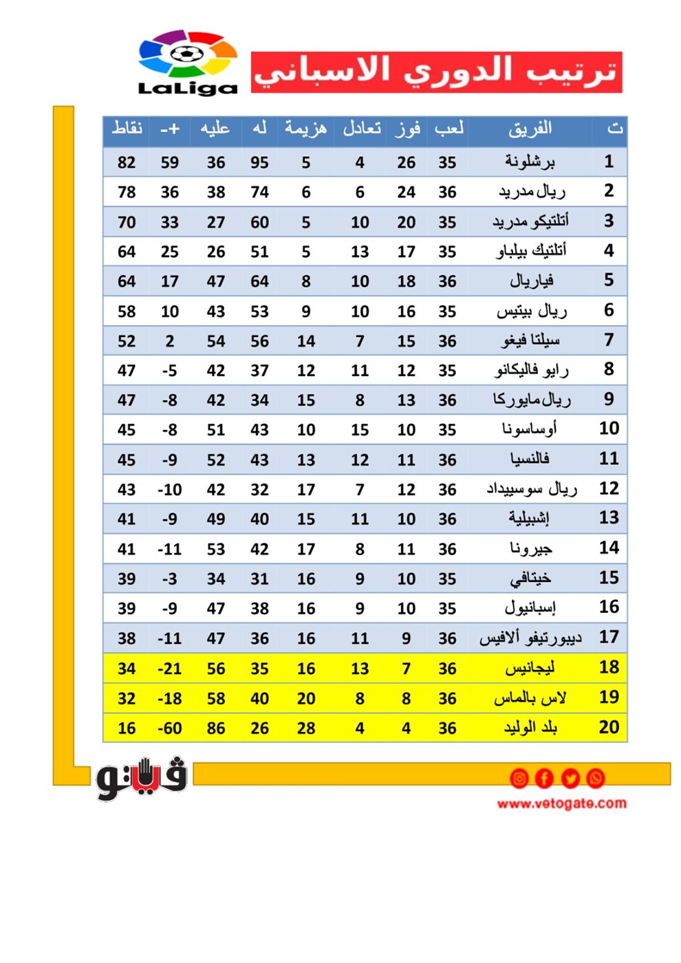 1. برشلونة، 82 نقطة.