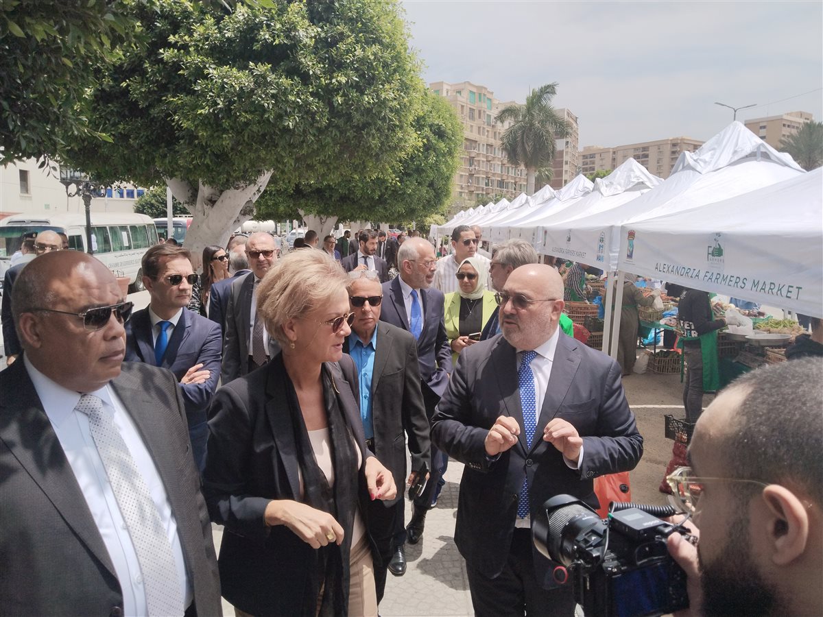 أجرت انجلينا أيخهورست سفيرة الاتحاد الأوروبي لدى مصر، برفقة أحمد الوكيل رئيس الغرفة التجارية بالإسكندرية جولة تفقدية بداخل سوق اليوم الواحد للمزارعين جراج سينما أمير وسط الإسكندرية.