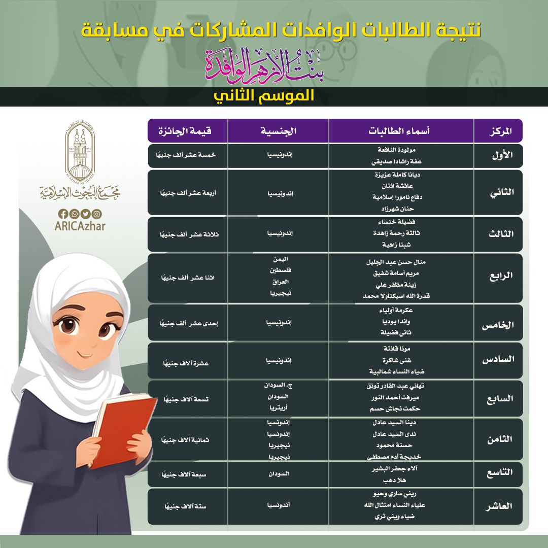 وجاءت في المركز الثامن كل من دينا السيد عادل وندى السيد عادل من إندونيسيا، وحسنة محمود وخديجة أدم مصطفى من نيجيريا، ونلن ثمانية آلاف جنيه. أما المركز التاسع فكان من نصيب آلاء جعفر البشير وهلا دهب من السودان، وحصلتا على سبعة آلاف جنيه. وأخيرًا، فازت بالمركز العاشر ريني ساري وحيو، وعلياء النساء امتثال الله، وضياء ويني تري من إندونيسيا، ونلن ستة آلاف جنيه لكل منهن.