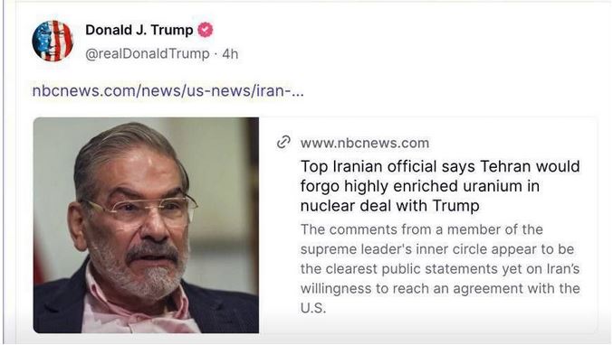 ونشر الرئيس الأمريكي دونالد ترامب على منصة "تروث سوشيال" مقطع فيديو للمستشار السياسي للمرشد الأعلى الإيراني علي شمخاني ملمحًا لاتفاق محتمل مع إيران.