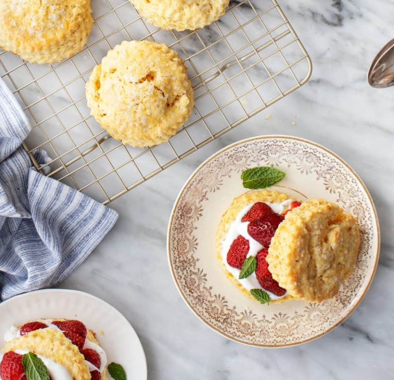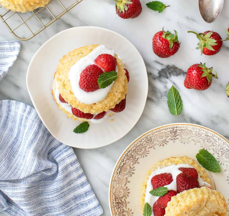 عند التقديم، تُقطع كل قطعة بسكويت إلى نصفين أفقيًا باستخدام سكين، وتُوضع طبقات من الفراولة الطازجة والكريمة المخفوقة بين نصفي البسكويت.