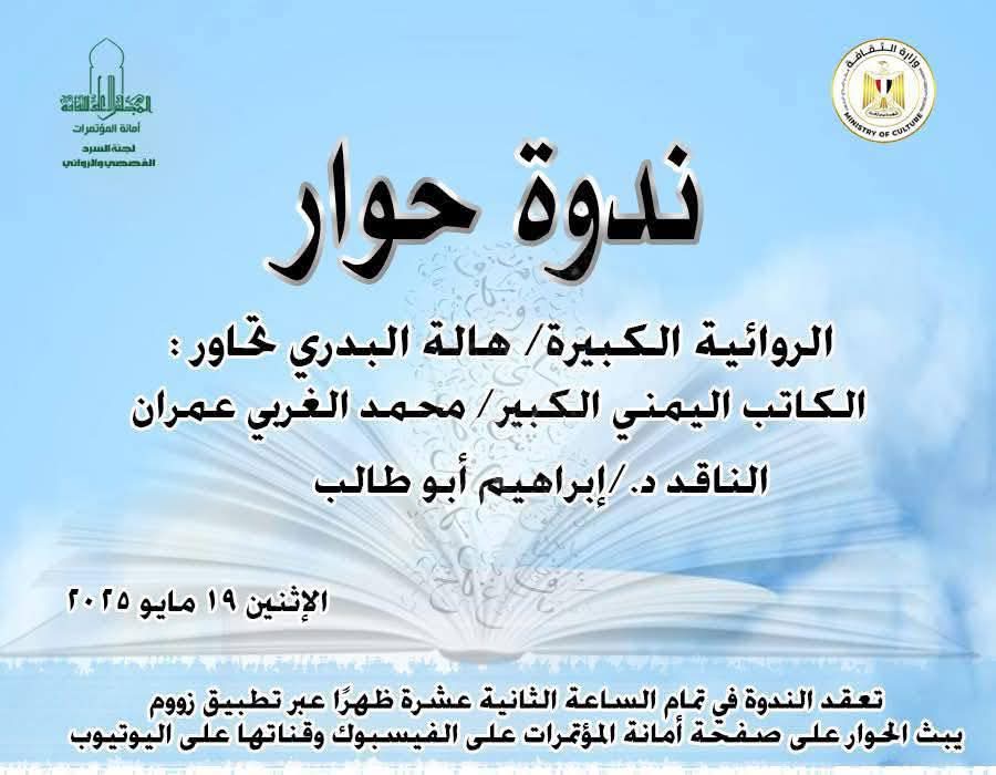 الإثنين 19 مايو 2025 الساعة 12:00 ظهرًا (أونلاين) ندوة "حوار ثقافي" بمشاركة الكاتب اليمني الكبير محمد الغربي عمران، الناقد د. إبراهيم أبو طالب (دكتوراه في الأدب)، بإدارة الروائية هالة البدري.