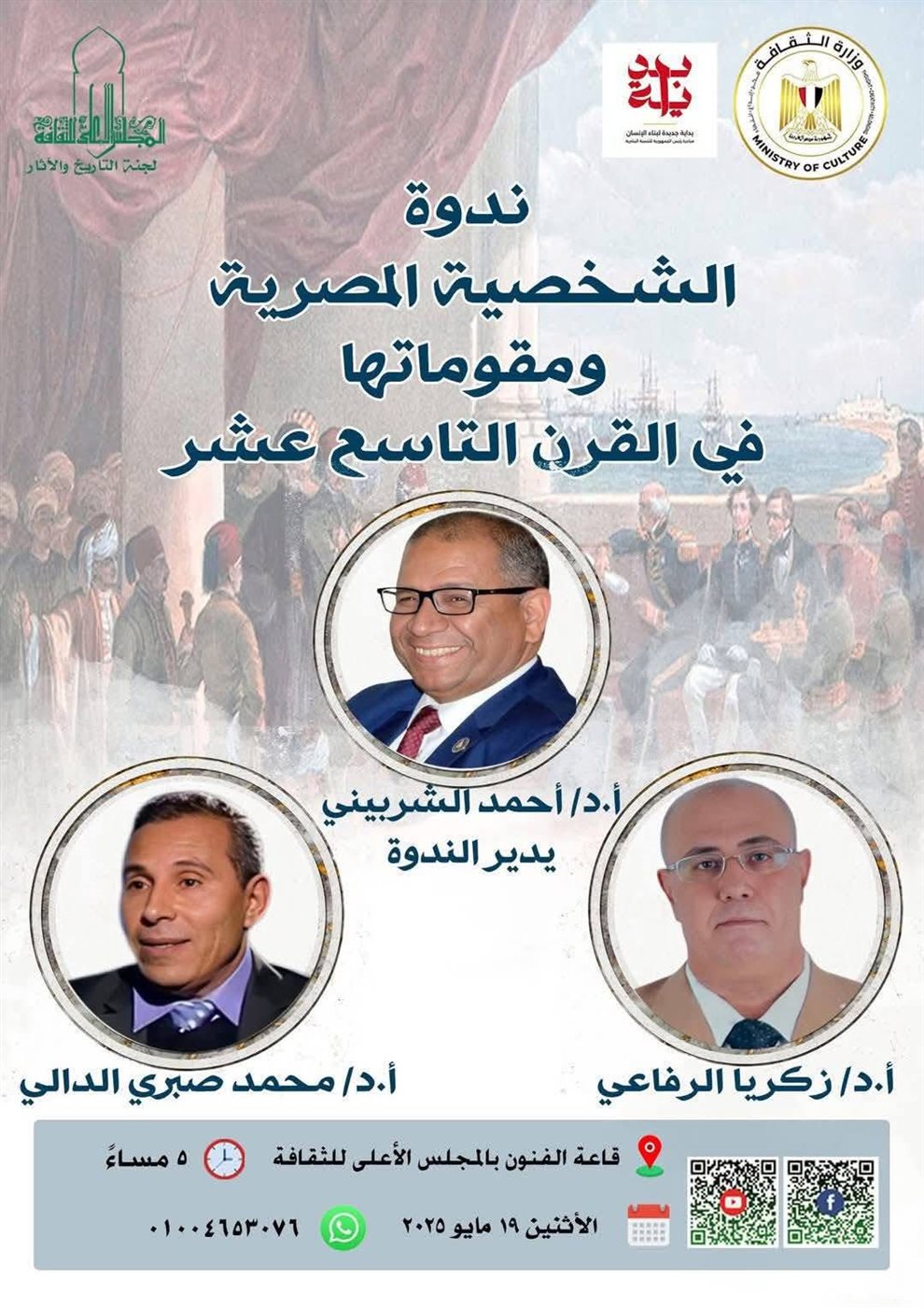 ويوم الإثنين الساعة 5:00 مساءً (قاعة الفنون) ندوة "الشخصية المصرية ومقوماتها في القرن التاسع عشر" د. زكريا الرفاعي (جامعة المنصورة)، د. محمد صبري الدالي(جامعة حلوان)، ود. أحمد الشربيني (جامعة القاهرة).