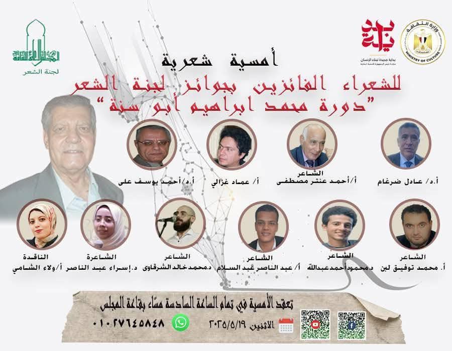 ثم في الساعة 6:00 مساءً (القاعة الرئيسية) أمسية شعرية "محمد إبراهيم أبو سنة... قصائد لا تموت"، ويشارك فيها:أحمد عنتر مصطفى، د. عادل ضرغام، وعماد غزالي (قراءات شعرية).