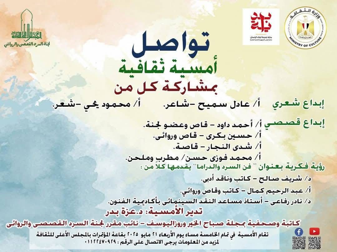 5:00 مساءً (قاعة المؤتمرات) أمسية "تواصل" (أدب وفن).. ويشارك فيها:أحمد داود وحسين بكري (قراءات قصصية)، محمد فوزي حسن(أغاني ومواويل).
