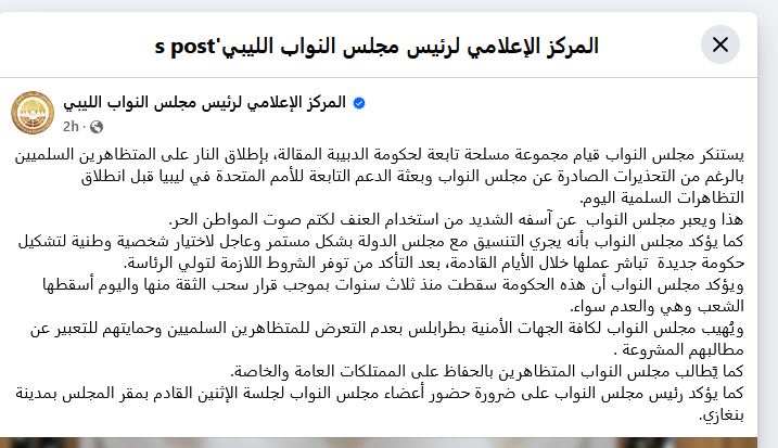 وأعرب المجلس في بيان رسمي، عن أسفه الشديد لاستخدام العنف لقمع صوت المواطن الليبي، معتبرًا ما حدث انتهاكًا صارخًا لحق التعبير والتظاهر السلمي الذي يكفله القانون.