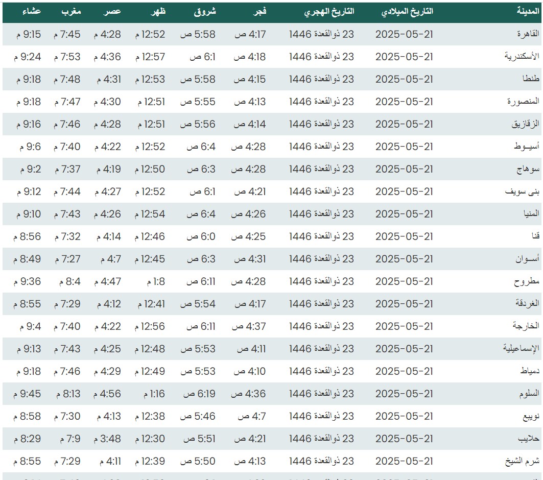 وفيما يلي مواقيت الصلاة، لعدد من مدن ومحافظات الجمهورية من واقع بيانات الهيئة العامة للمساحة