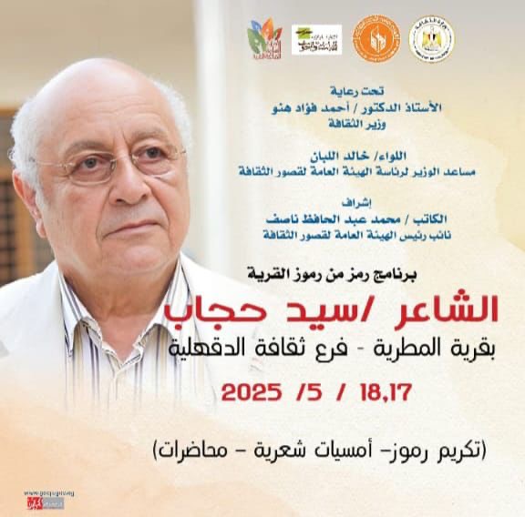 تحتفي الهيئة العامة لقصور الثقافة، برئاسة اللواء خالد اللبان، اليوم السبت، بشاعر العامية الكبير سيد حجاب، ضمن برنامجها الثقافي "رمز من رموز القرية"، المعني بتكريم الشخصيات المؤثرة التي أثرت المشهد الثقافي والفكري في مصر، في إطار أنشطة وزارة الثقافة.