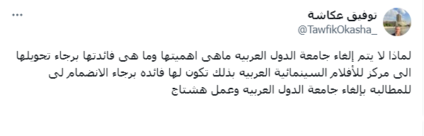 ودعا توفيق عكاشة متابعيه إلى الإنضمام له في المطالبة بتحويل جامعة الدول العربية إلى مركز للأفلام السينمائية العربية، قائلًا إن تحويل الجامعة العربية الى مركز للأفلام السينمائية يجعل لها فائدة".