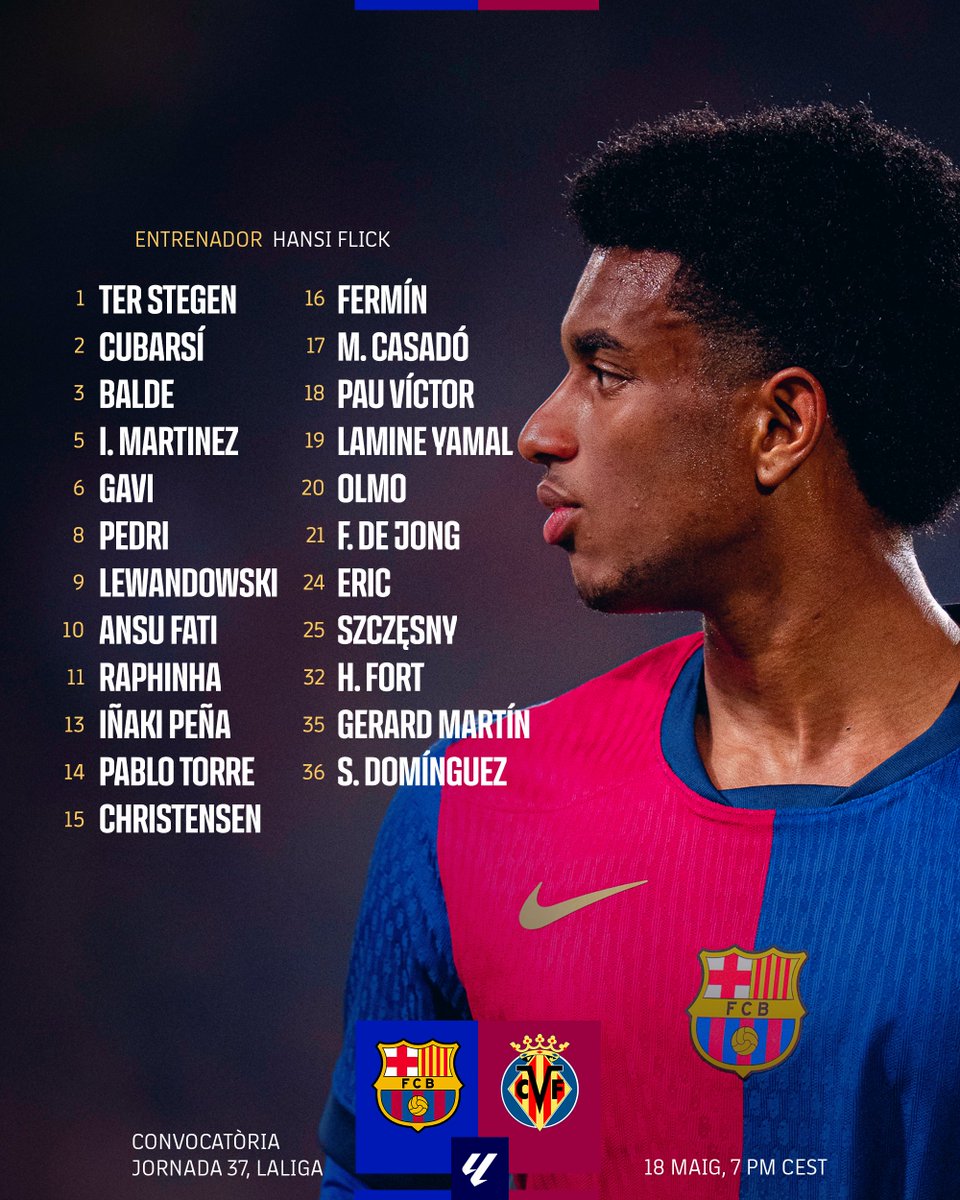 أعلن هانز فليك مدرب برشلونة عن قائمة فريقه أمام فياريال، اليوم الأحد على ملعب "مونتجويك"، في مباراة سيحتفل خلالها البرسا مع جماهيره وعلى ملعبه بلقب الدوري الإسباني.