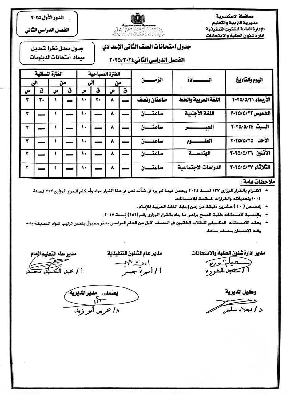 أعلنت مديرية التربية والتعليم بمحافظة الإسكندرية اليوم، موعد امتحانات الصف الثانى الاعدادى للفصل الدراسي الثاني ٢٠٢٥.