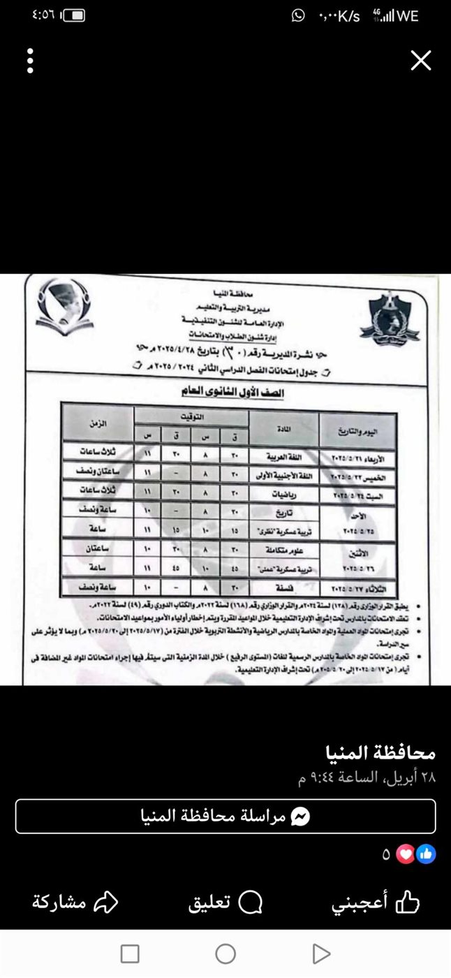 جدول امتحانات الصف الأول الثانوي في المنيا الترم الثاني 2025