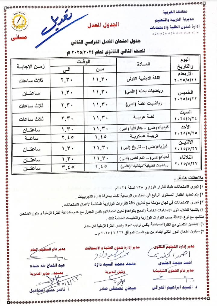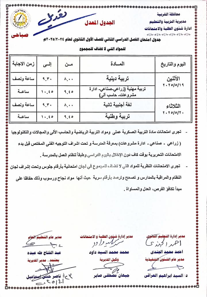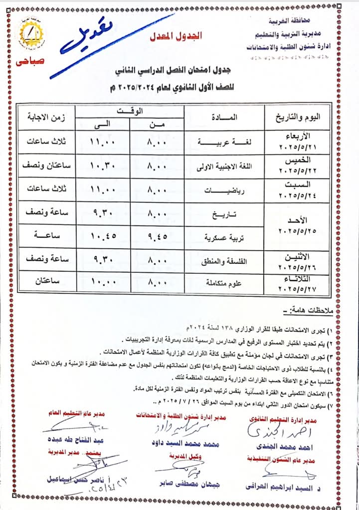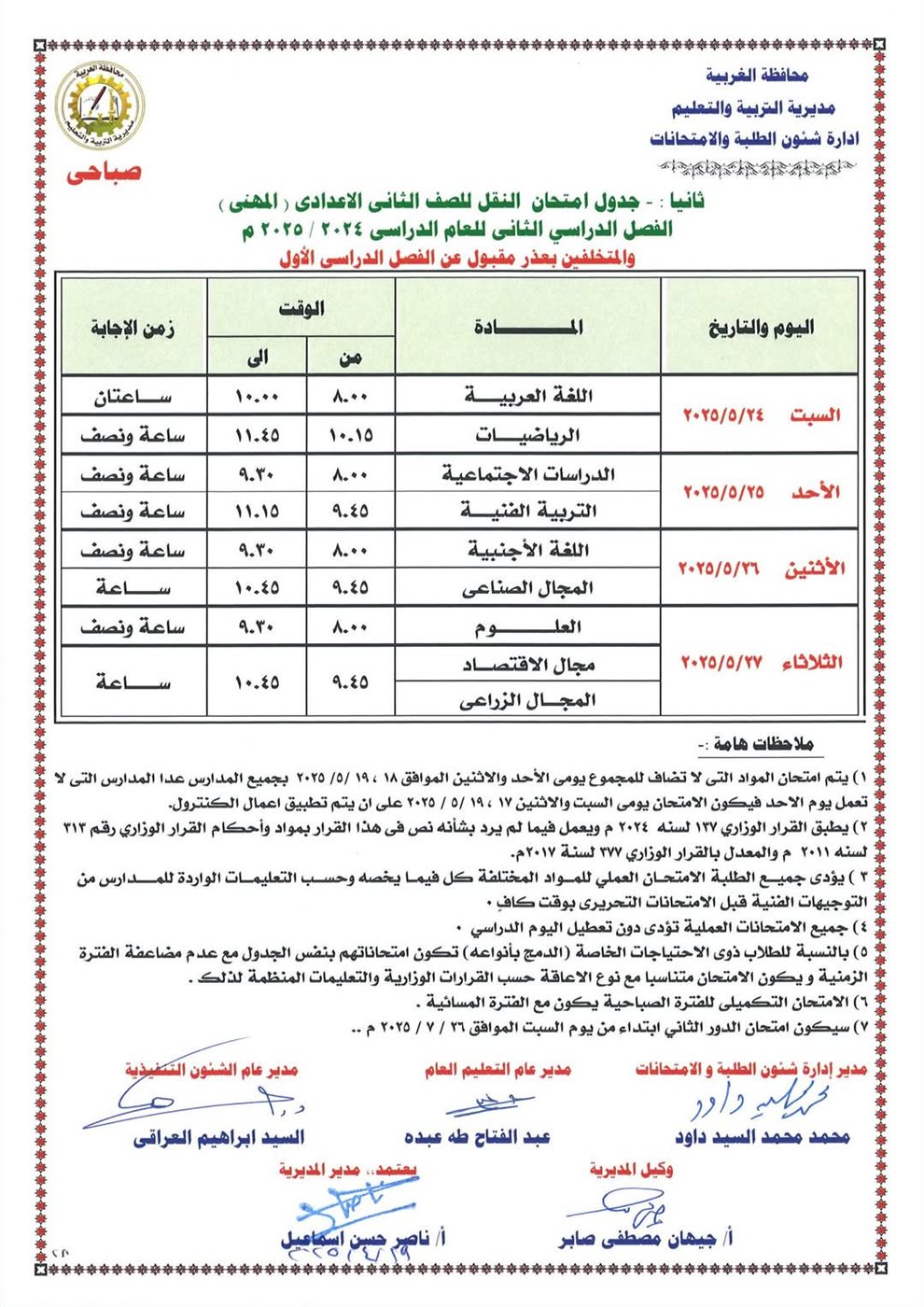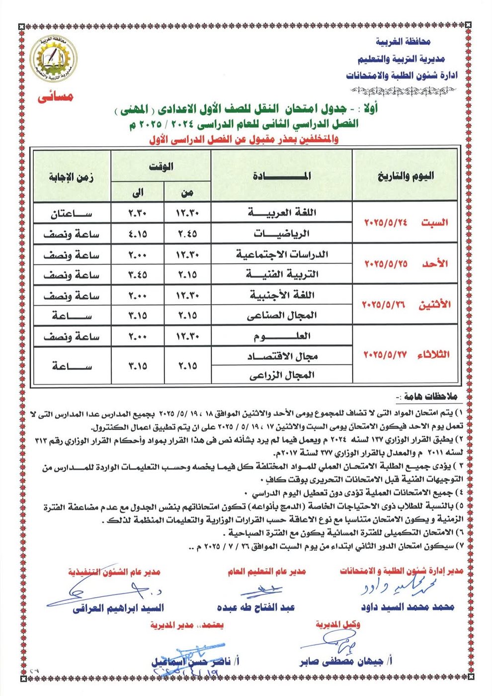 تعليم الغربية تعلن جداول امتحانات نهاية العام للشهادة الإعدادية والأول والثاني الثانوي