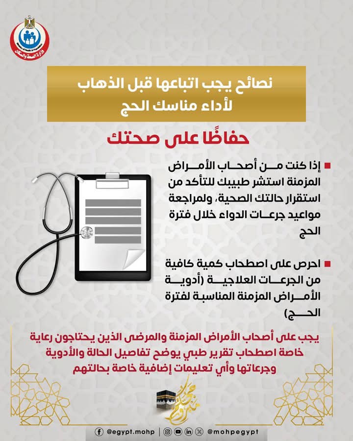 ونصحت وزارة الصحة أصحاب الأمراض المزمنة بضرورة استشارة الطبيب للتأكد من استقرار الحالة الصحية لهم، ولمراجعة مواعيد جرعات الدواء خلال فترة الحج
