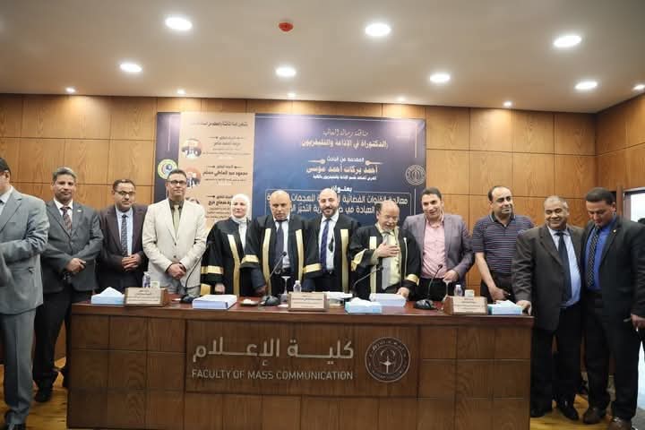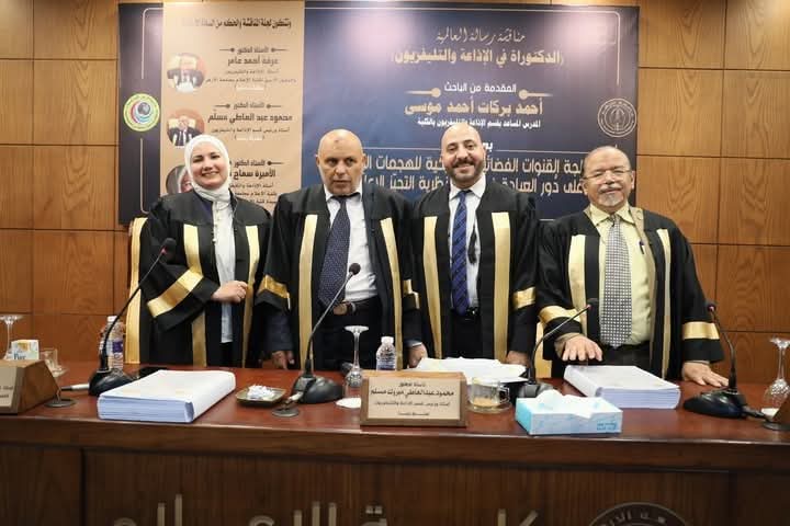 نوقشت اليوم الأحد في كلية الإعلام بنين بجامعة الأزهر رسالة الدكتوراه- تخصص الإذاعة والتليفزيون، للباحث أحمد بركات موسى مدير المركز الإعلامي بالأزهر الشريف.