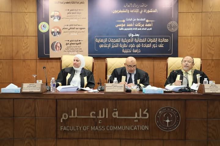 جاءت الرسالة بعنوان: "معالجة القنوات الفضائية الأمريكية للهجمات الإرهابية على دور العبادة في ضوء نظرية التحيز الإعلامي- دراسة تحليلية".