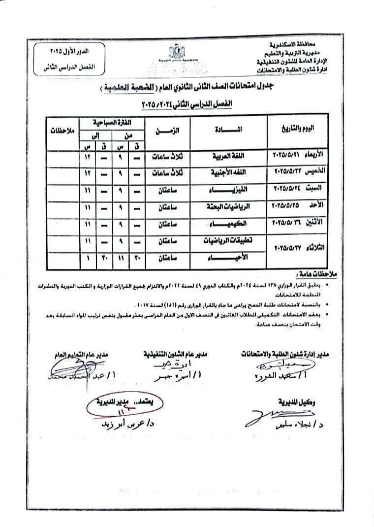 أعلنت مديرية التربية والتعليم بمحافظة الإسكندرية اليوم، موعد امتحانات الصف الثانى الثانوى الشعبة العلمية،للفصل الدراسي الثاني ٢٠٢٥.