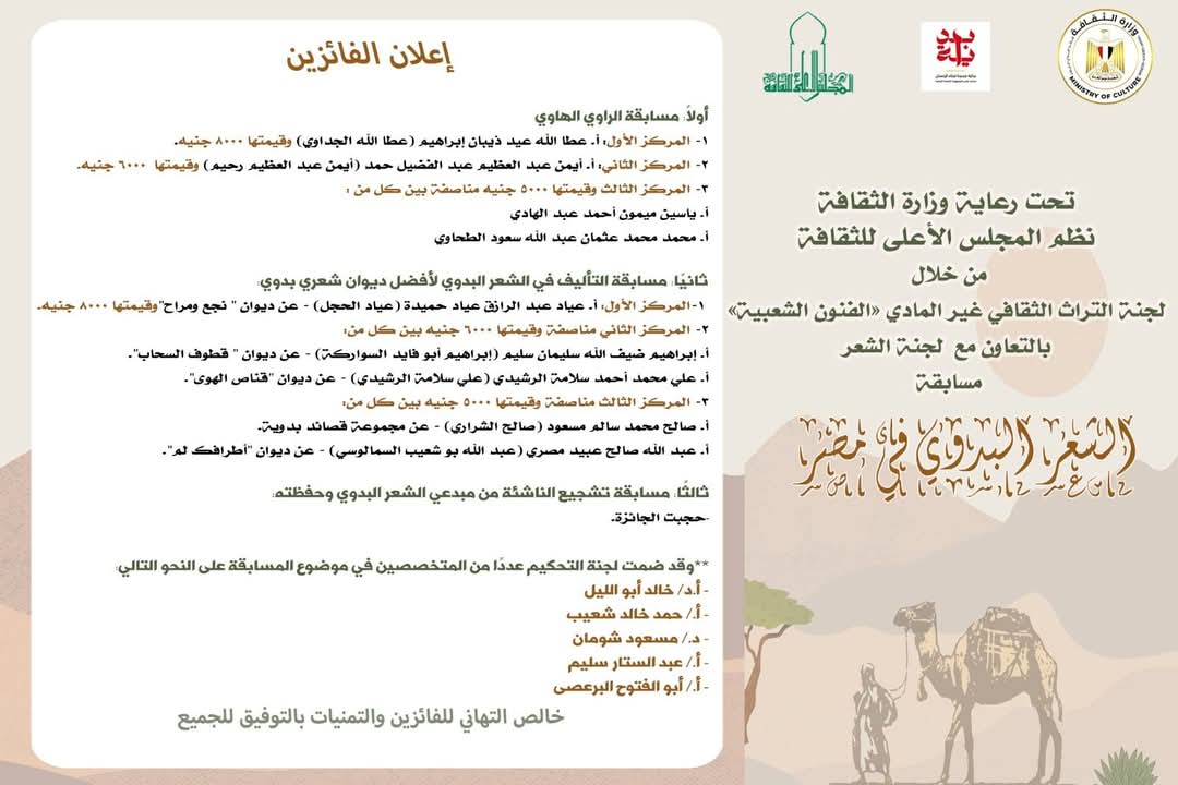 أعلن المجلس الأعلى للثقافة أسماء الفائزين في مسابقة "الشعر البدوي في مصر"، التي نظمتها لجنة التراث الثقافي غير المادي "الفنون الشعبية" بالتعاون مع لجنة الشعر.