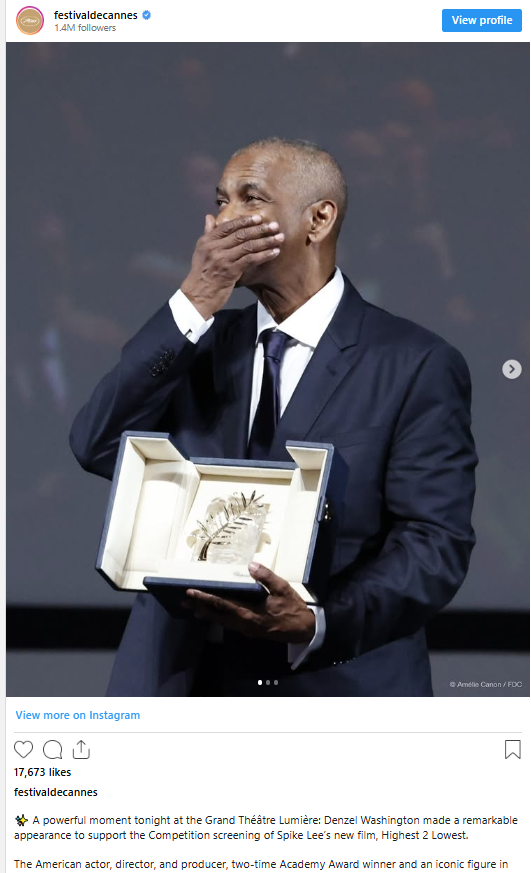 وقال واشنطن عن التكريم: هذه مفاجأة كبيرة لي، لذا أنا متأثر للغاية. إنها فرصة رائعة للتعاون مع أخي مجددًا، أخي من أم أخرى، وأن أكون هنا مرة أخرى في كان.