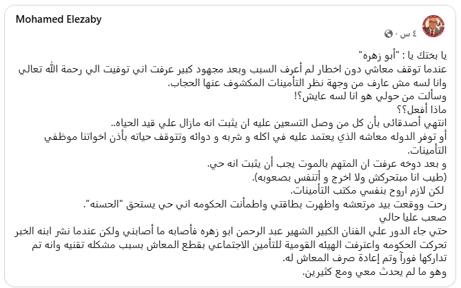 وقال “العزبي”عبر حسابه على "فيس بوك": "يا بختك يا أبو زهرة، عندما توقف معاشي دون إخطار لم أعرف السبب وبعد مجهود كبير عرفت أني توفيت إلى رحمة الله تعالى.. وأنا لسه مش عارف من وجهة نظر التأمينات المكشوف عنها الحجاب".