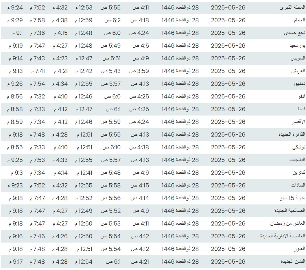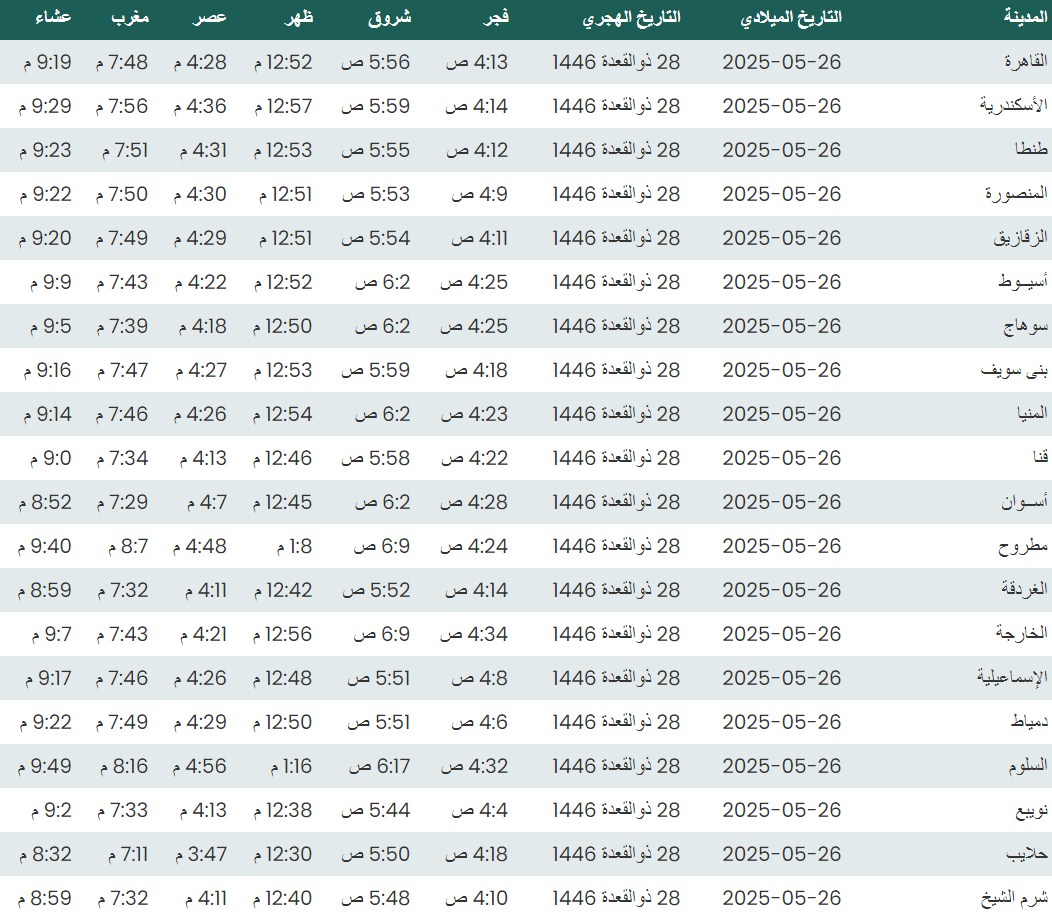 وفيما يلي مواقيت الصلاة، لعدد من مدن ومحافظات الجمهورية من واقع بيانات الهيئة العامة للمساحة