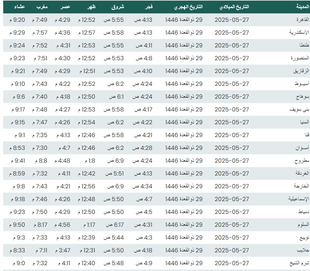 مواقيت الصلاة اليوم الثلاثاء 27 – 5 - 2025 في القاهرة والمحافظات