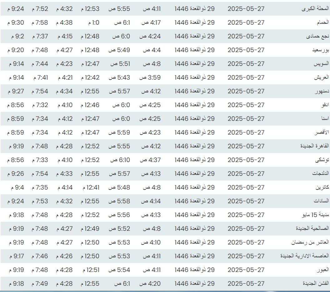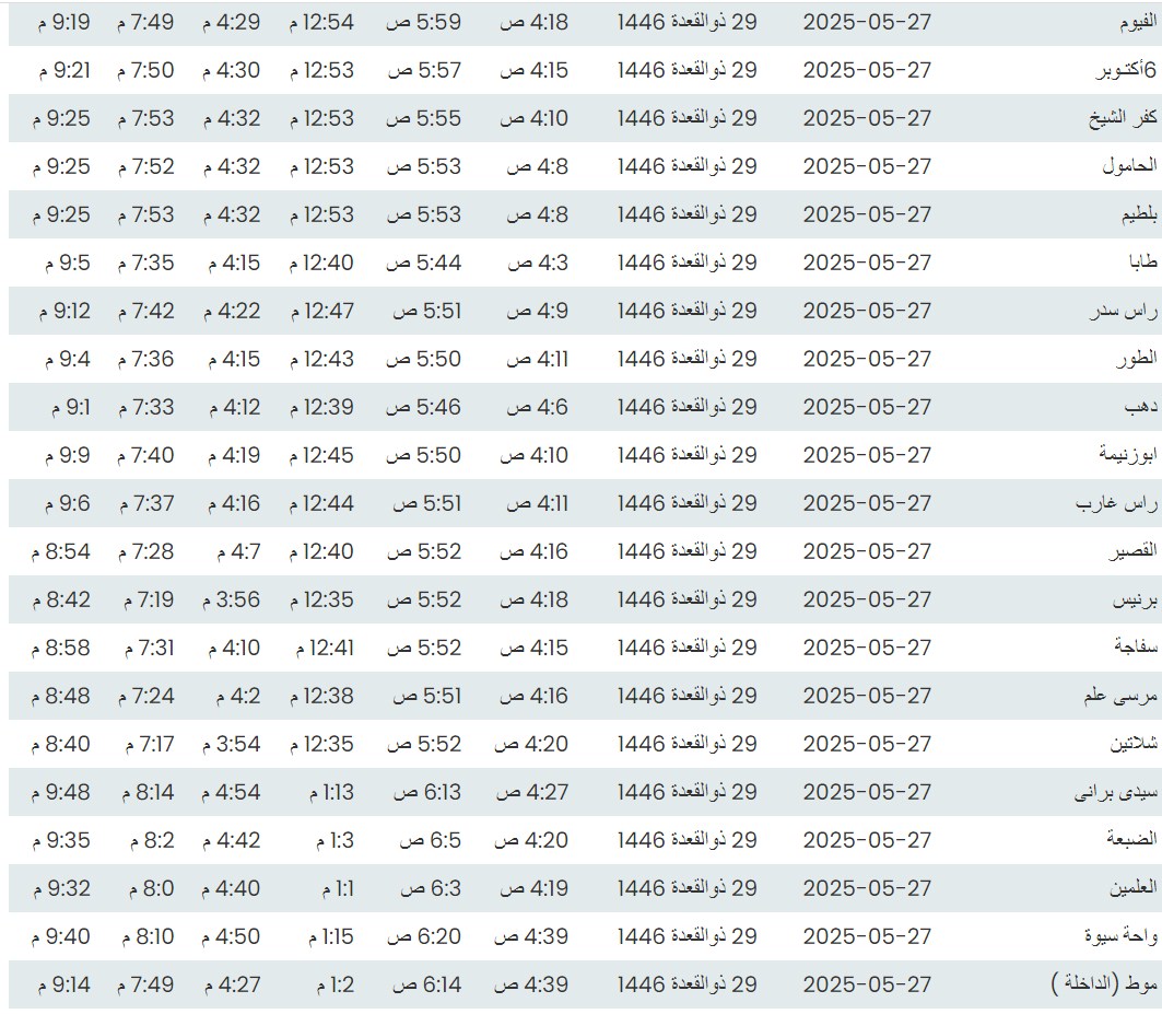 مواقيت الصلاة اليوم وفقًا للتوقيت المحلي لمدينتي القاهرة والإسكندرية وكذلك لعدد من مدن ومحافظات الجمهورية من واقع بيانات الهيئة العامة للمساحة: