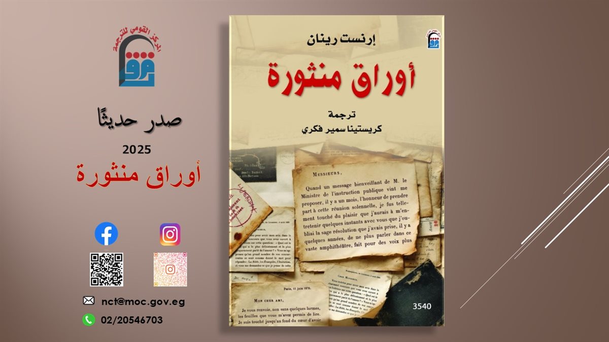 صدر حديثًا عن المركز القومي للترجمة برئاسة الدكتورة كرمة سامي الطبعة العربية من كتاب "أوراق منثورة" تأليف إرنست رينان، وقامت بترجمته عن اللغة الفرنسية كريستينا سمير فكري.