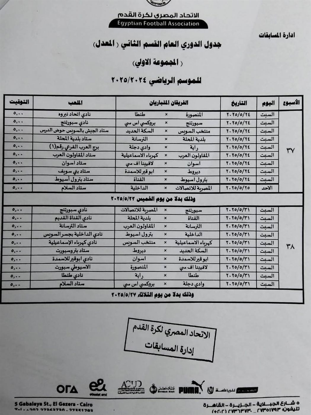 وقرر اتحاد الكرة تعديل مواعيد مباريات آخر جولتين في مسابقة دوري القسم الثاني المجموعة الأولى أو ما يعرف بدوري المحترفين.