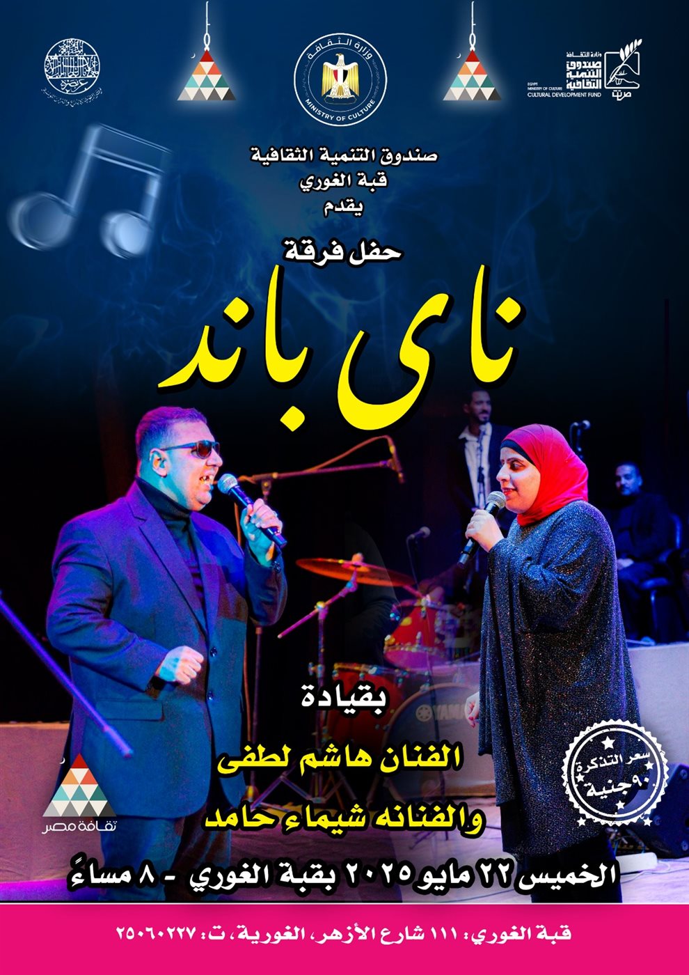 ينظم مركز إبداع قبة الغوري بشارع الأزهر، التابع لـ صندوق التنمية الثقافية، حفلًا موسيقيًّا لفرقة "ناي باند"، وذلك يوم الخميس 22 مايو الجاري في تمام الساعة الثامنة مساءً.